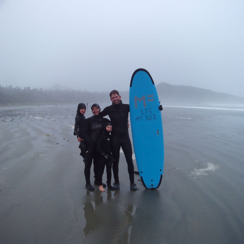 A family stands united with their surfboard on a misty morning.
